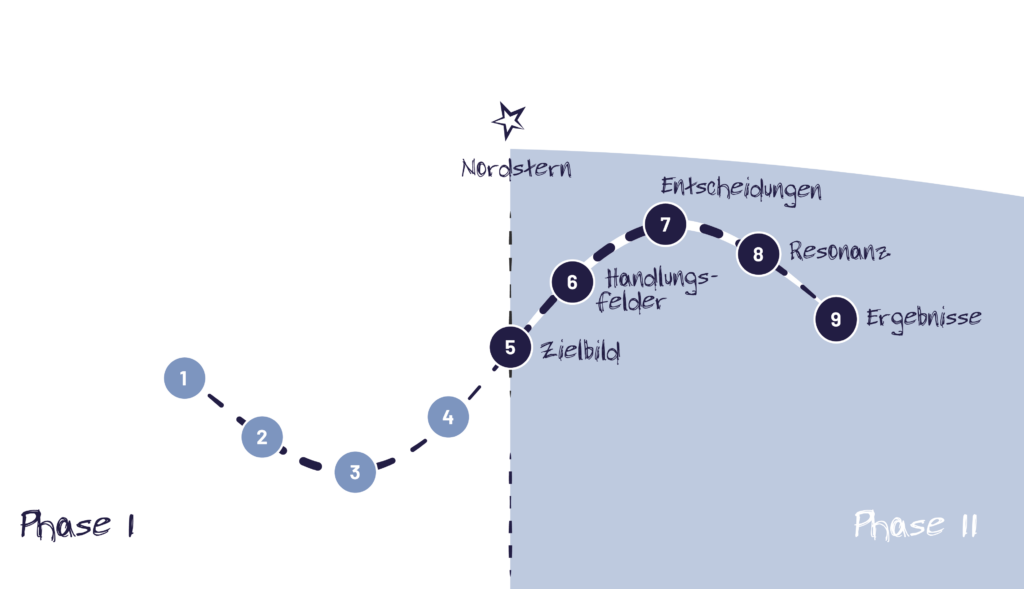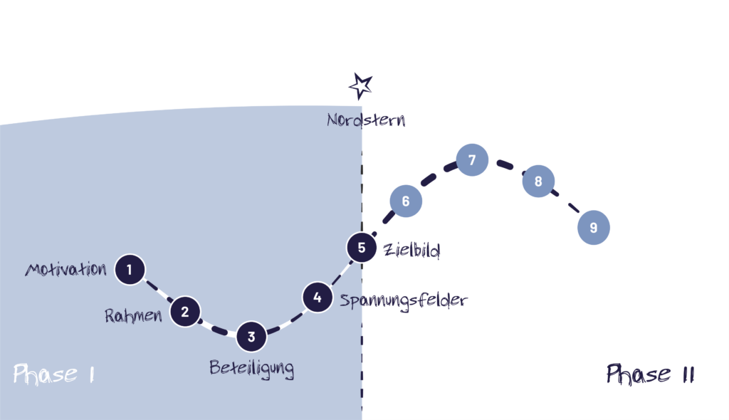 In der Phase I liegt der Grundstein für eine erfolgreiche Transformation. Ausgehend von der Motivation entsteht eine zielführende Strategie, die die Richtung weist und die Leitplanken setzt. Sie schafft den Rahmen, innerhalb dessen das Projekt mit den vorhandenen Ressourcen und Vorgaben umgesetzt wird.